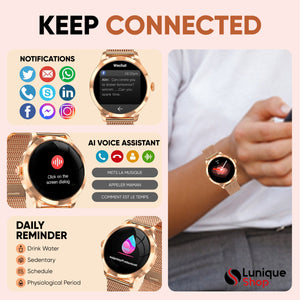 🌸 La montre connectée femmes dispose d'un suivi des cycles menstruels pour les femmes. Cette fonctionnalité unique vous permettra de mieux comprendre votre corps et d'anticiper vos périodes de fertilité. C'est un excellent cadeau femme. A offrir à l'occasion d'un anniversaire, Noël, Saint Valentin ou encore de la fête des mères.